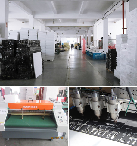 擁有最新自動化精準分切機7臺,自動150噸雙邊進料裁斷機8臺,自動雙邊粘合機6臺,雕刻機8臺。其他各種生產設備齊全,精準度高,質量保障。